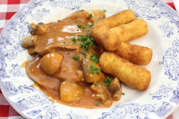 we starten met een klein aperitiefje, gevolgd door rundstong in Madeirasaus met kroketten.