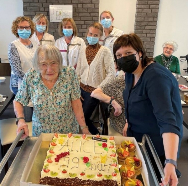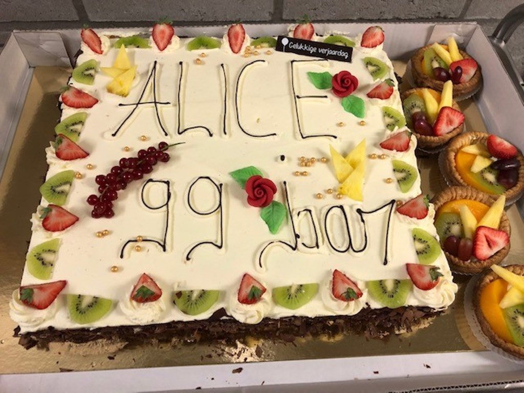 Hiep Hiep Hoera! Alice wordt 99 jaar! Daarom trakteert Alice haar medebewoners op een lekker stukje taart.Iedereen is welkom vanaf 14u in de cafetaria om te komen proeven!