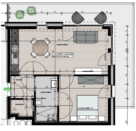 • Iedere zorgflat is voorzien van een inkom, een gezellige living, ingerichte keuken met kookplaat met veiligheidssysteem, berging, slaapkamer, badkamer met toilet en inloopdouche, ruim terras.