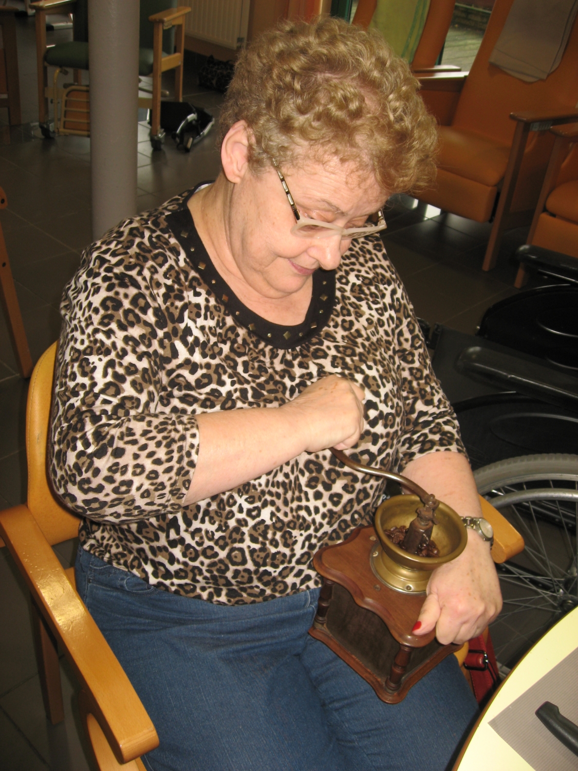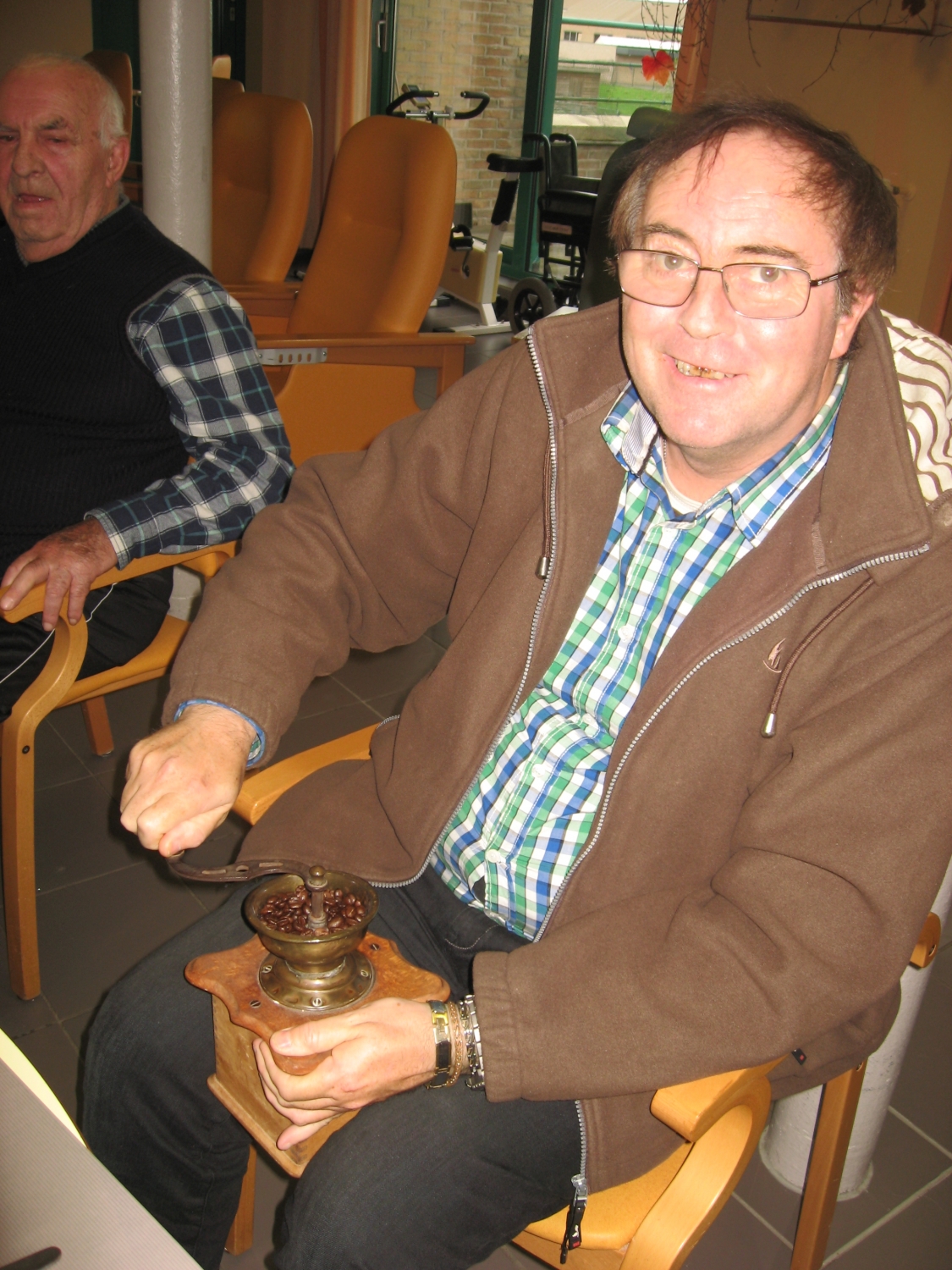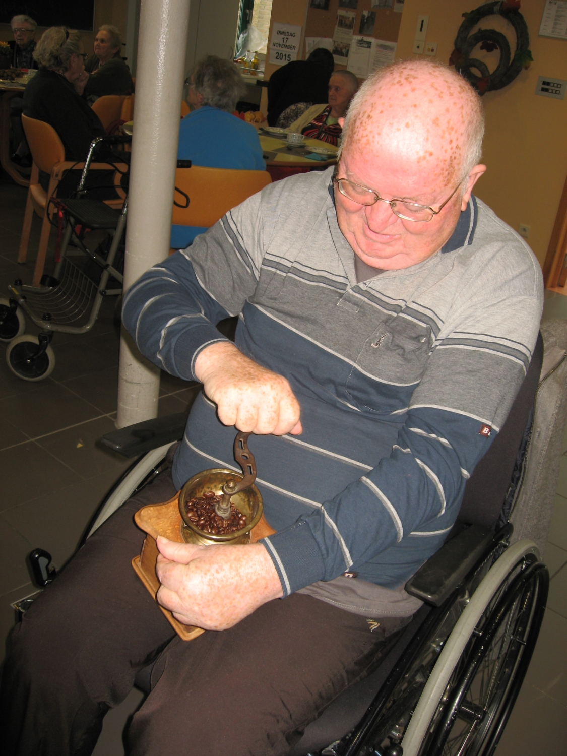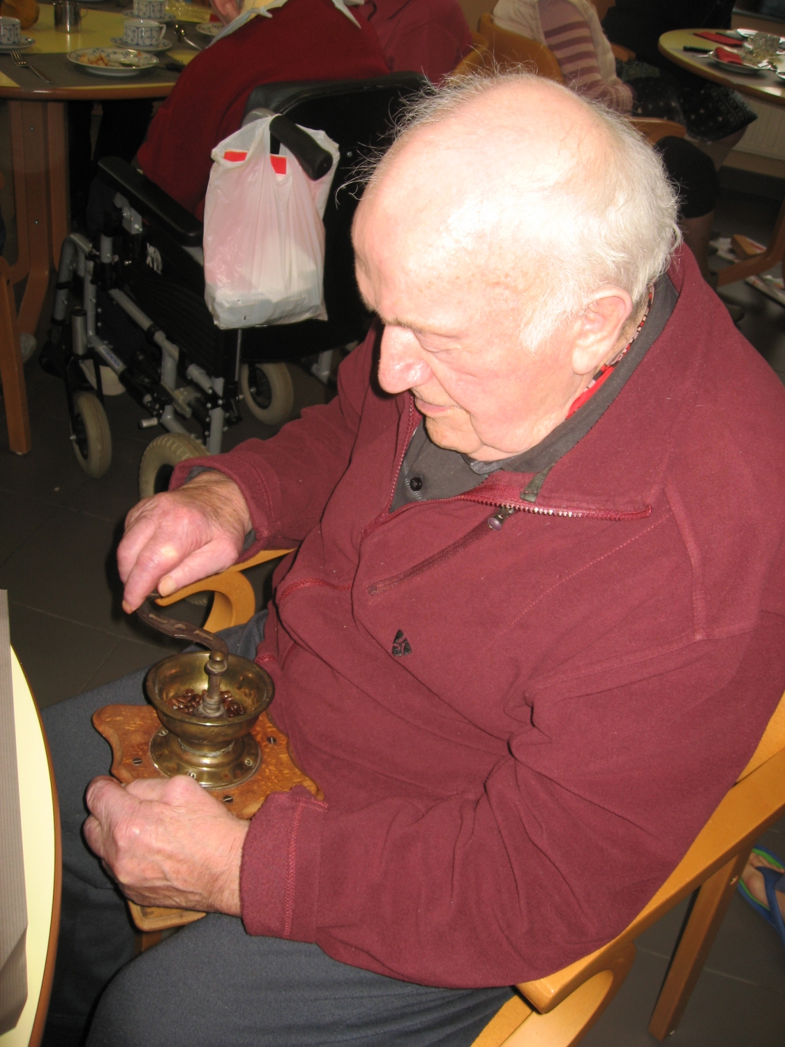 Voor de koffietafel op 17 november konden alle bezoekers van Tagaste hun eigen koffie malen op de ouderwetse manier!