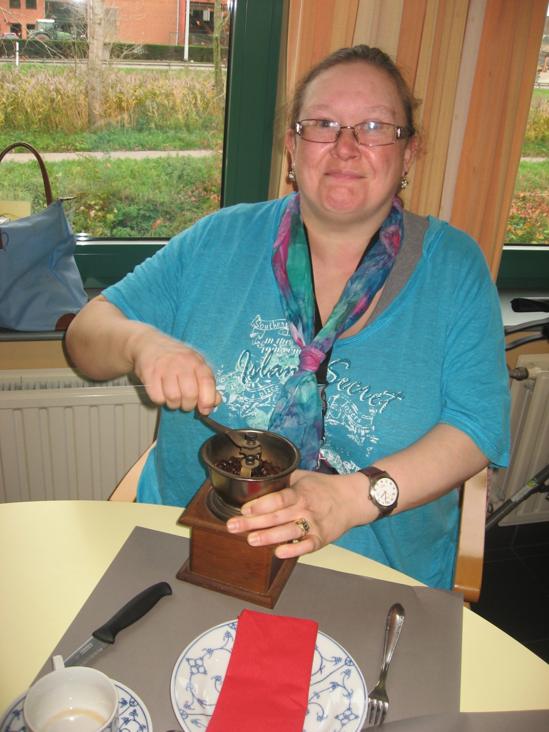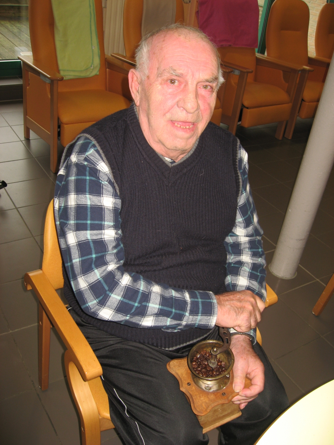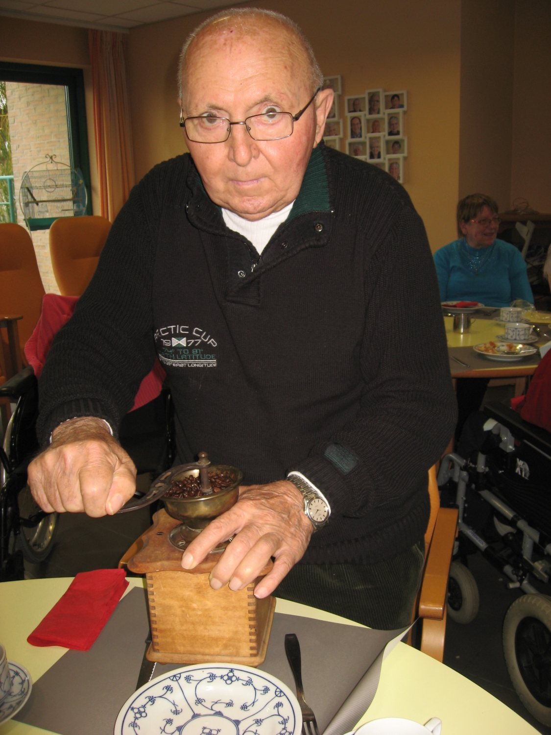 Voor de koffietafel op 17 november konden alle bezoekers van Tagaste hun eigen koffie malen op de ouderwetse manier!