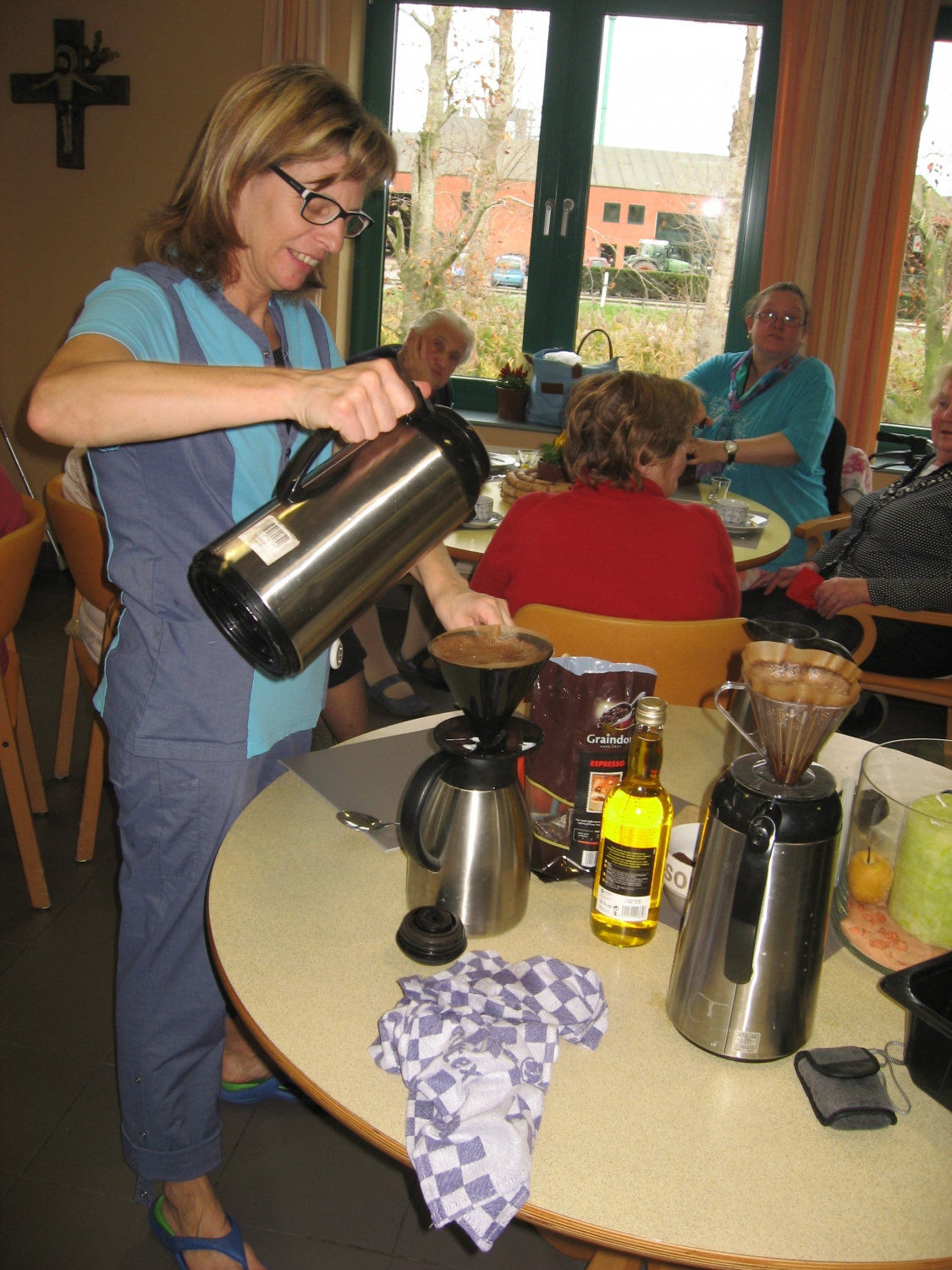 De bezoekers van Tagaste kunnen mee aan tafel schuiven voor taart, elexir en koffie gemalen op de ouderwetse manier.